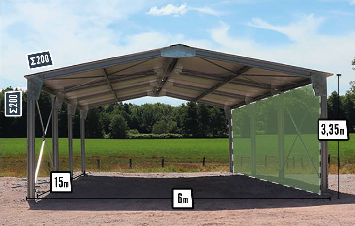 Abri bi-pente en kit 6x15x3,35m bardage 1 long pan