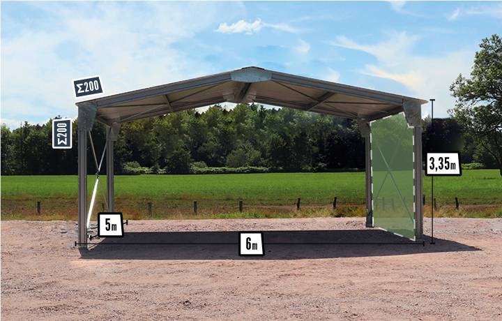Grande hauteur (3.35m en bas de pente) : idéal pour abriter de grands véhicules