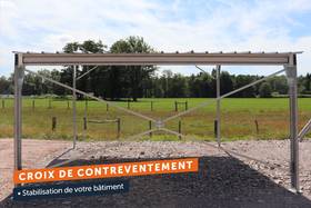 - Stabilité de l’ossature grâce aux goussets, aux croix de contreventement, aux liernes tubulaires réglables (profils fermés plus rigides que les profils ouverts et évitant ainsi le déversement des pannes) et à la bretelle de renfort qui assure la rigidité et permet de garder la travée ouverte