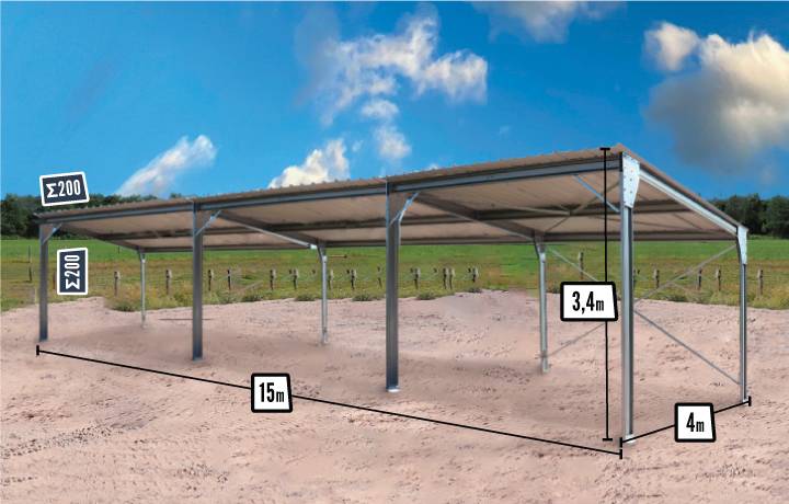 D’une surface de 60m², robustesse et durabilité garanties de sa structure galvanisée à chaud. Notre abri de 15m de longueur vous offre tout l’espace nécessaire pour abriter votre matériel ou vos véhicules. Sa couverture en tôles 1er choix à 5 ondes renforcées est aussi facile à monter que sa structure !
