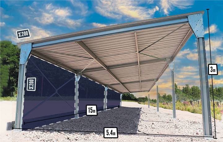 Abri monopente en kit 5,4x15x3m bardé sur 1 long pan bas
