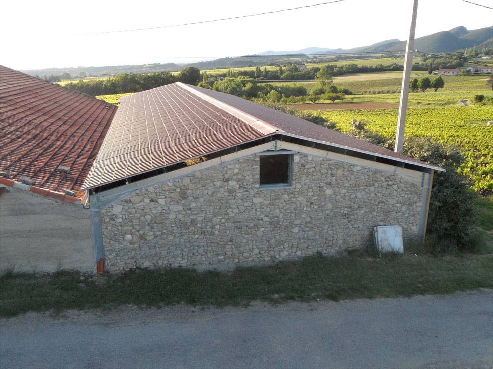 La seconde est au niveau de la couverture. Si le bardage est réalisé en panneaux sandwich isolant, la couverture aussi. Malgré ce que les photos laissent à penser, il ne s'agit pas d'une toiture classique, réalisée en tuiles, mais bel et bien du panneaux sandwich. Ces panneaux imitation tuiles sont du plus bel effet pour ce bâtiment de stockage dans le sud de la France.