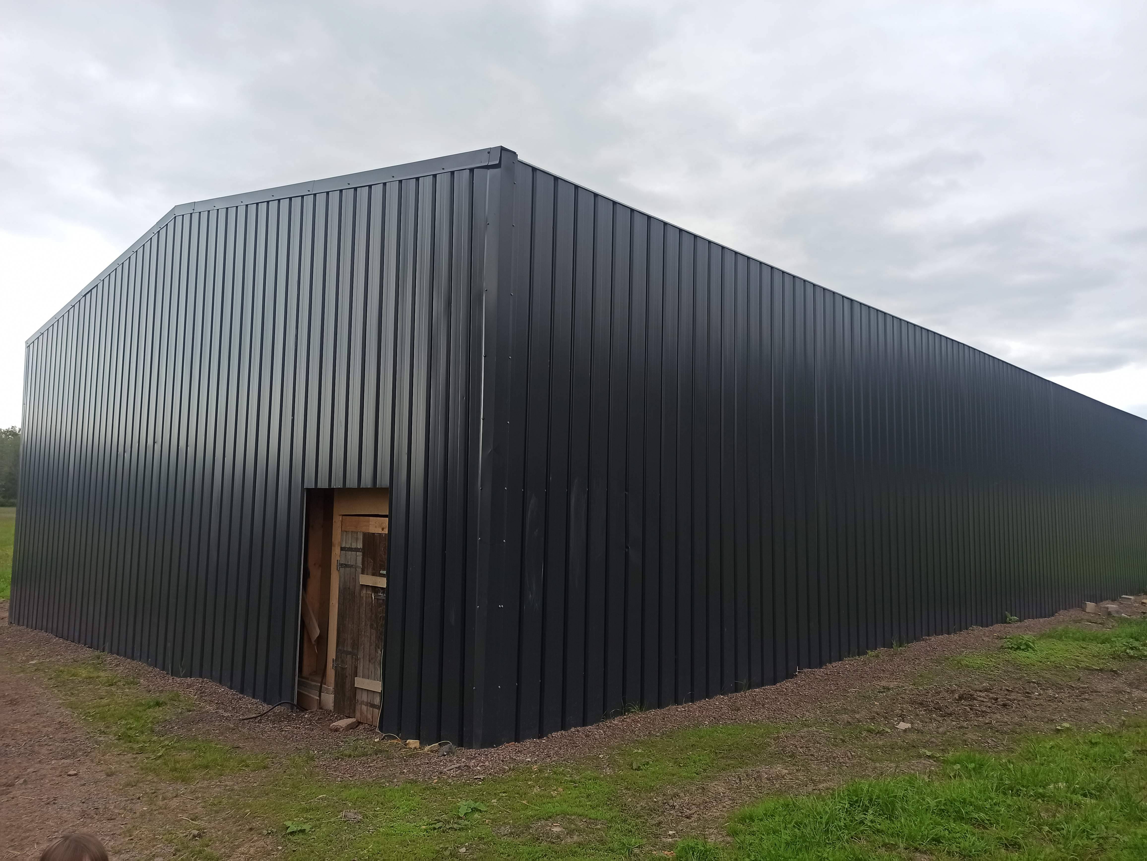 Le bâtiment fourni est un modèle de notre gamme standard, bardé sur trois côtés, avec une structure bi-pente. Mesurant 12.6m en largeur, 25m en longueur, et 5m en hauteur en bas de pente, il offre une surface de 315m².