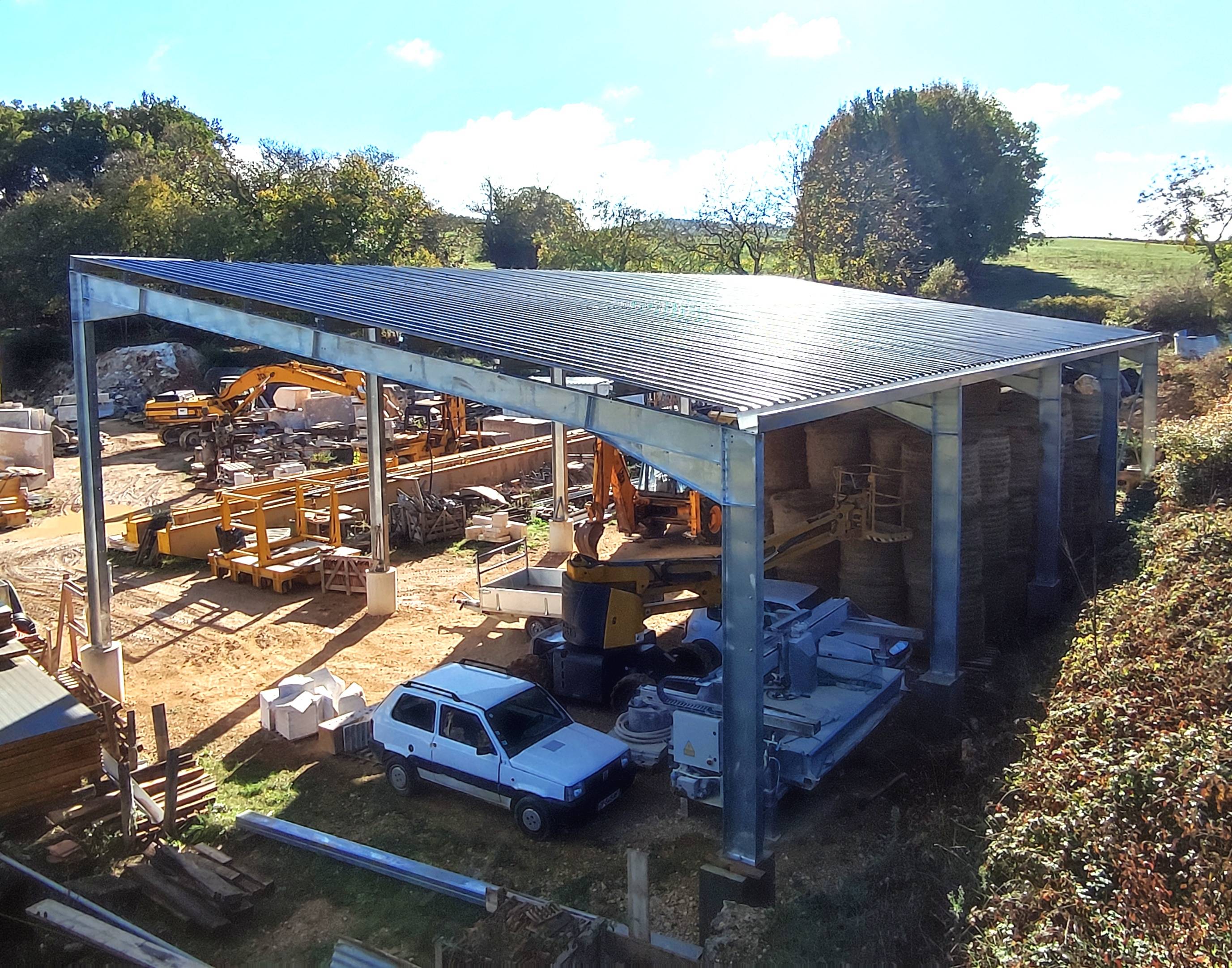 Pour répondre aux besoins spécifiques de M. Brea, nous avons réalisé un bâtiment monopente ouvert de notre gamme standard, avec une largeur de 11.66 m, une longueur de 24 m et une hauteur de 6 m.