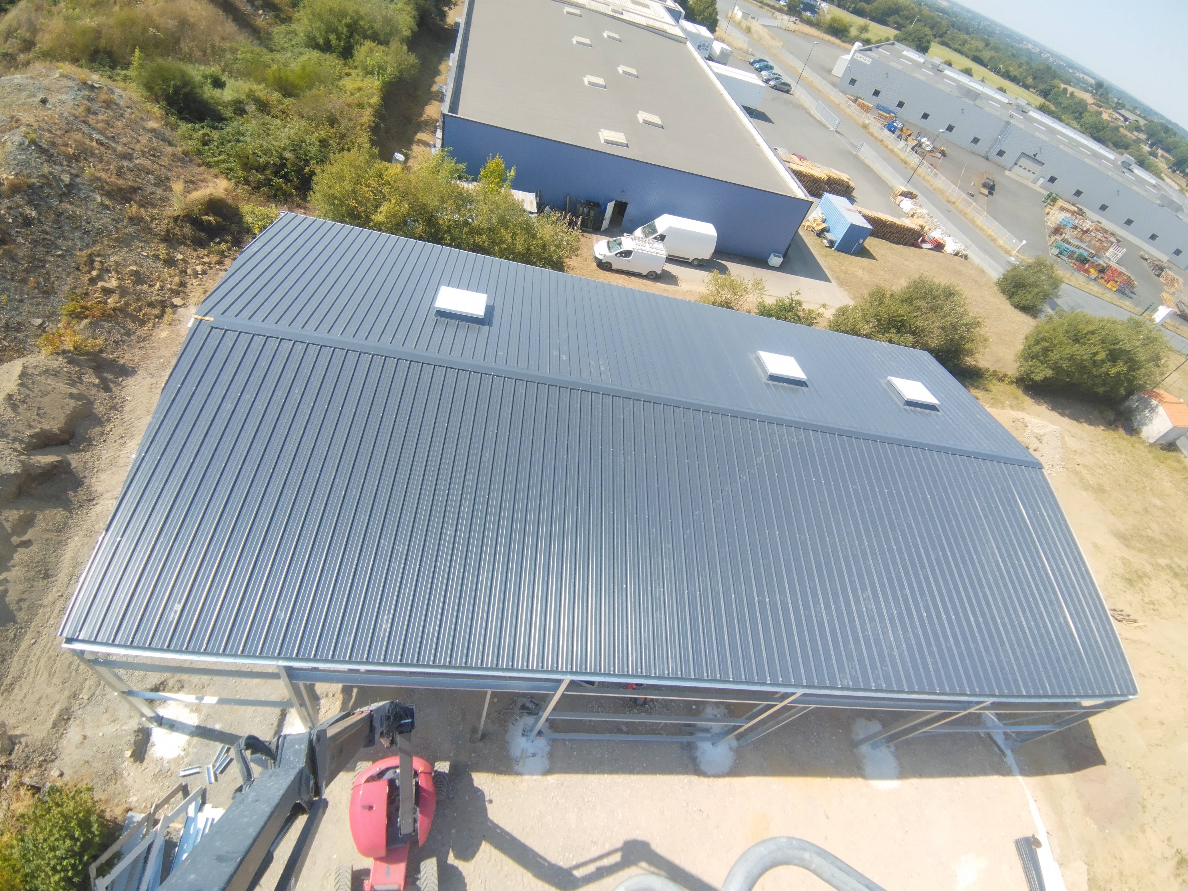 Pour M. Rabreau, nous avons mis en place un bâtiment industriel standard de 498 m² (16.60m de largeur et 30m de longueur). Il comporte une couverture en panneaux sandwich, 3 exutoires de fumée, 4 portes sectionnelles dont 2 motorisées et deux fenêtres en double vitrage argon avec 2 ouvertures vers l'extérieur, idéal pour l'activité de son entreprise.